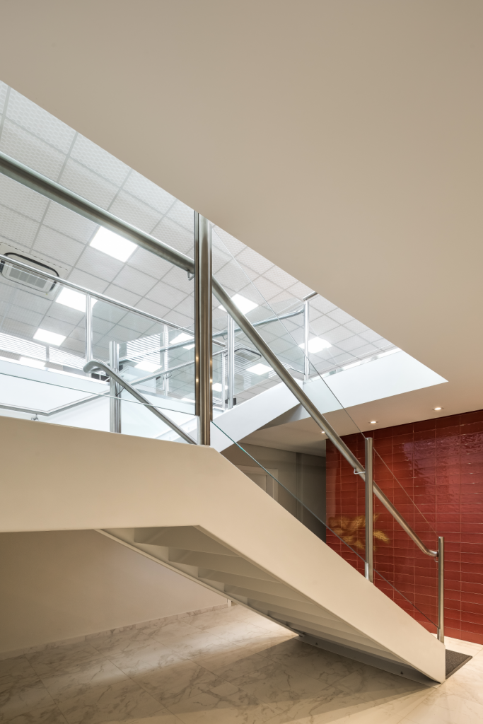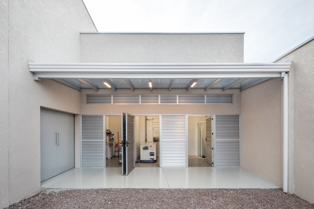 Nos fundos foi construído um “núcleo técnico” que abriga despensa, banheiros acessíveis e gerador. Também é onde está localizada a Caixa D’Água. O acesso ao mezanino do edifício é resolvido por duas escadas: uma metálica e outra em concreto armado.